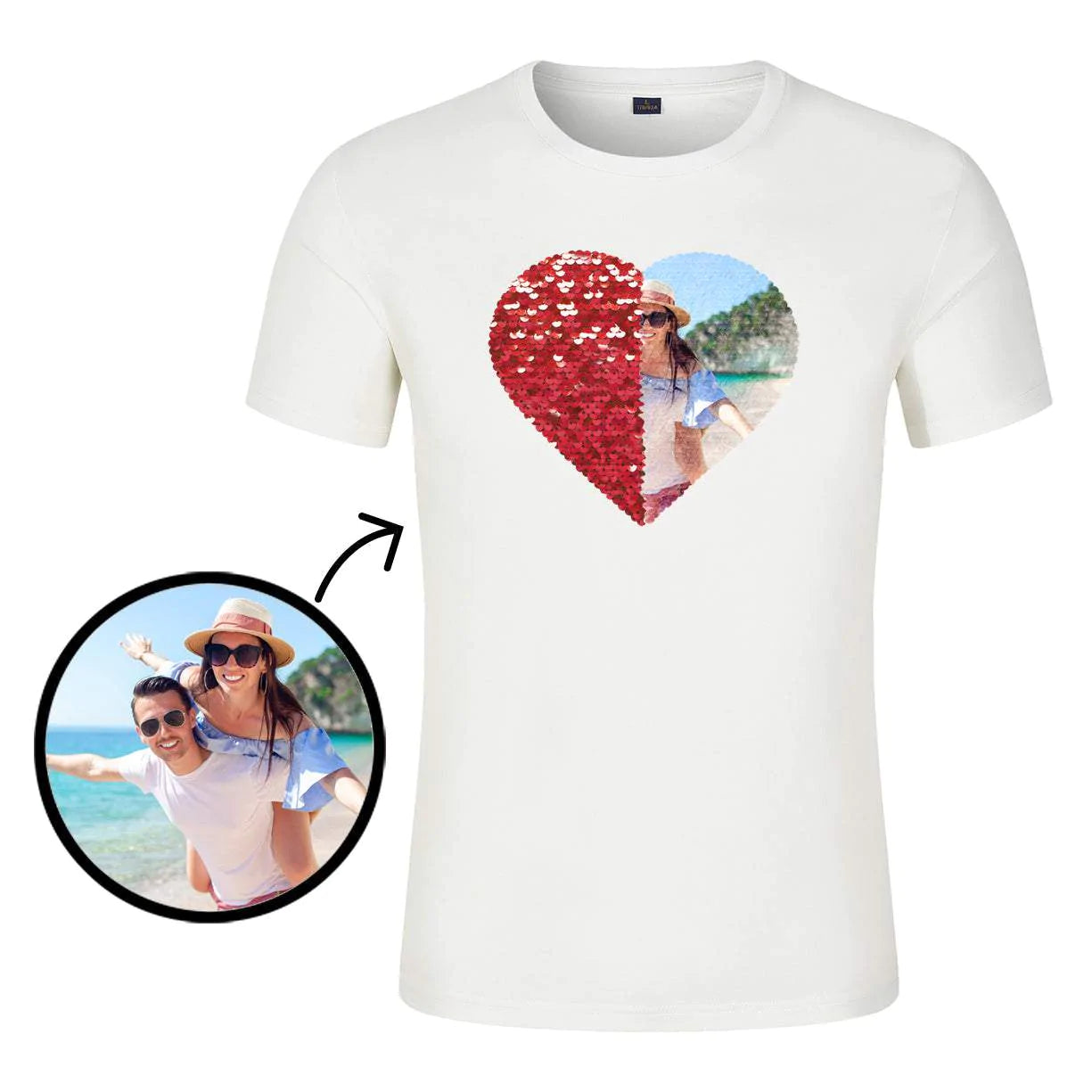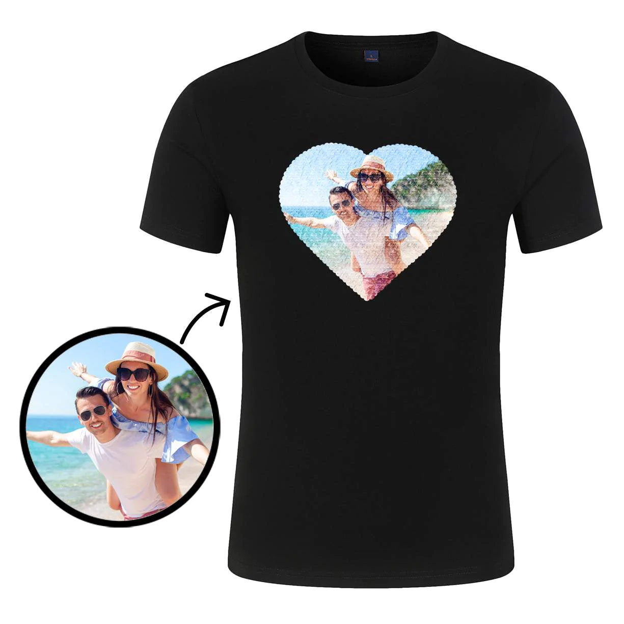 Unveil your love story with our Custom Couple Photo Flip Sequin T-Shirt. Made from a soft blend of cotton and polyester, this personalized tee offers daily comfort in sizes XXS-3XL. Available in white, black, and grey, it features a unique flip sequin design for a magical reveal.