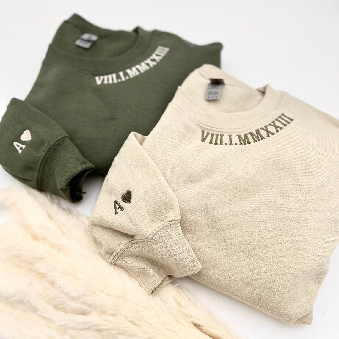 Custom Embroidered Neckline Roman Numeral Sweatshirt with Initial On Sleeve Anniversary Gift for Couple & Friend