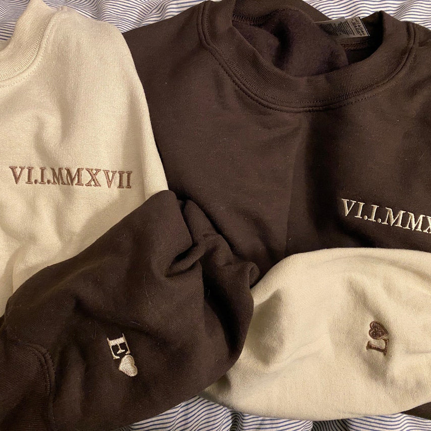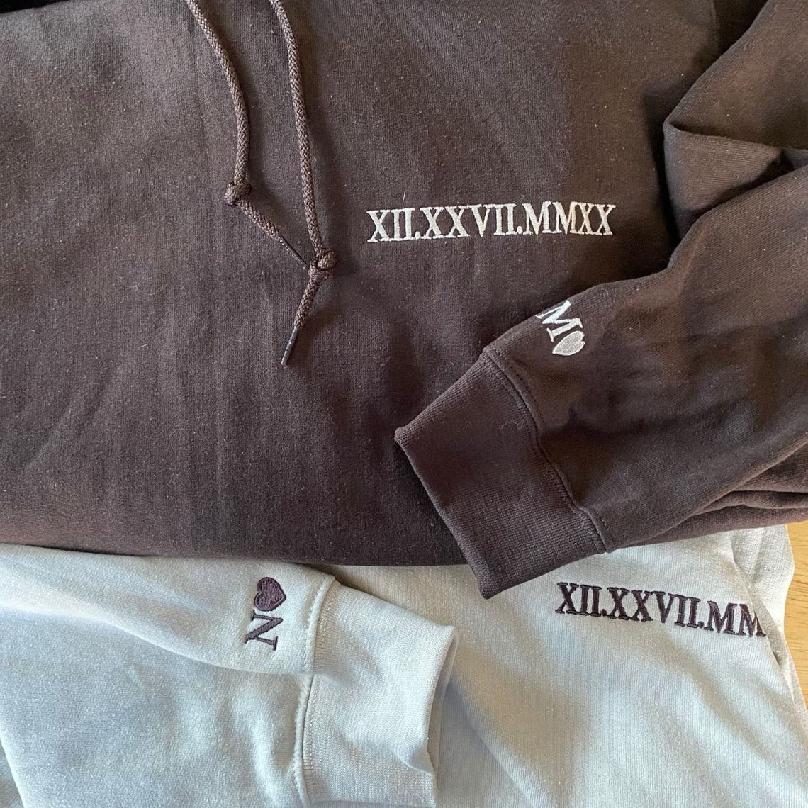 Custom Embroidered Roman Numeral Sweatshirt with Initial on Sleeve Gift for Couple & Anniversary