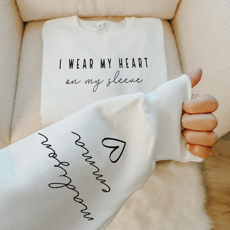 Custom Mom Sweatshirt I Wear My Heart On My Sleeve Sweatshirt with Kids Name on Sleeve