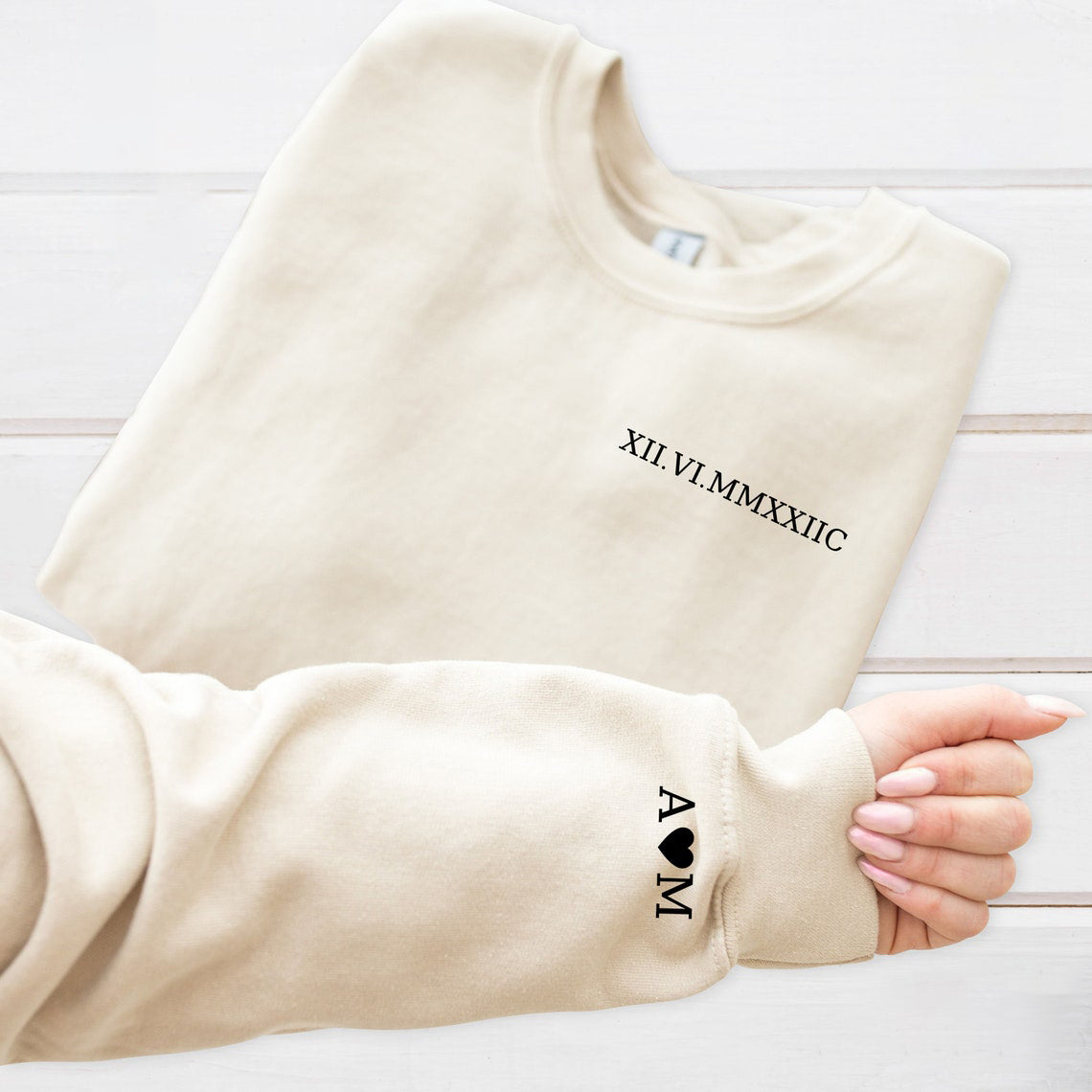 Introducing our Personalized Roman Numeral Date Sweatshirt, a perfect choice for commemorating special moments. This custom sweater features Roman numerals representing a significant date, such as a memorable anniversary or a cherished Valentine's Day. With the option to add custom initials on the sleeves, this sweater becomes a unique and heartfelt gift for him. Crafted with comfort and style in mind, it's a thoughtful way to celebrate love and milestones.