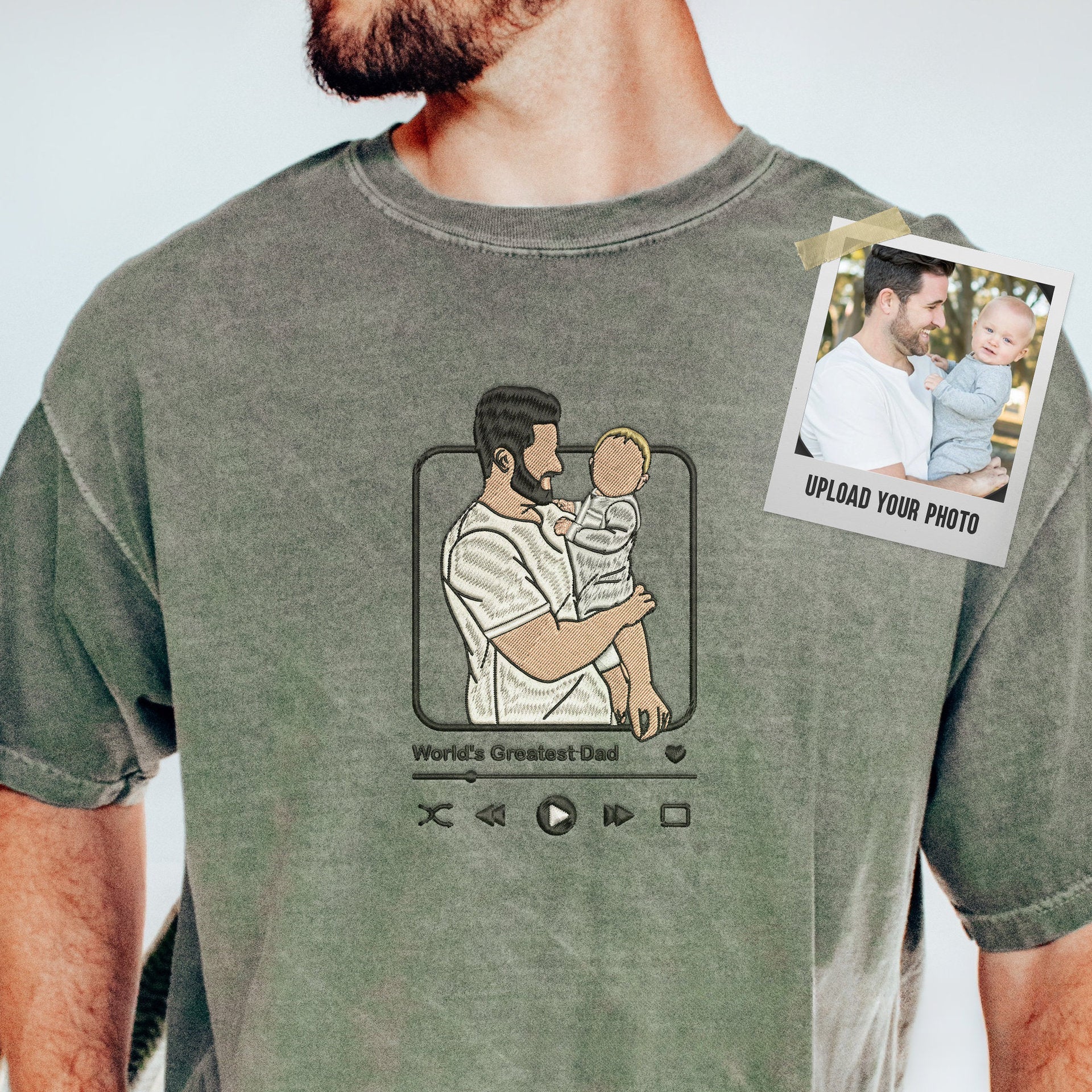 Customized Embroidered Dad & Kid Portrait from Photo Music Albums Short Sleeve T-Shirt Gift for Father's Day
