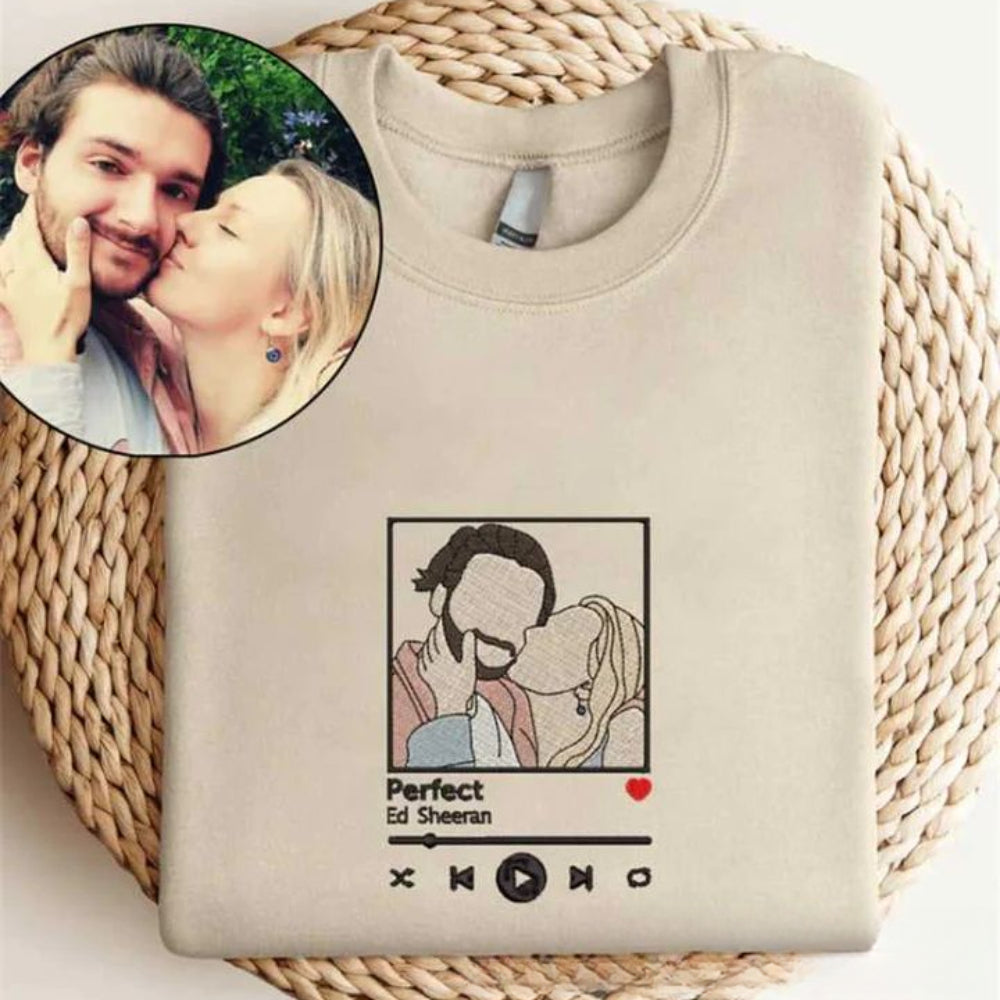 Celebrate your love and musical preferences with a custom portrait sweatshirt featuring outline photo embroidery and your favorite song. Snuggle up in style with our Personalized Photo Embroidered Sweatshirt for Couples. Crafted from cozy cotton, its customizable design adds a touch of romance to daily wear. Perfect for cherishing memories together.