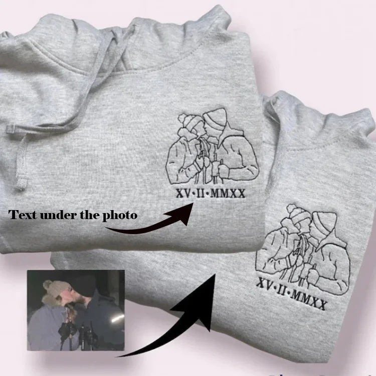 Personalized Embroidered Couple Photo Outline Hoodie with Roman Numerals/Text