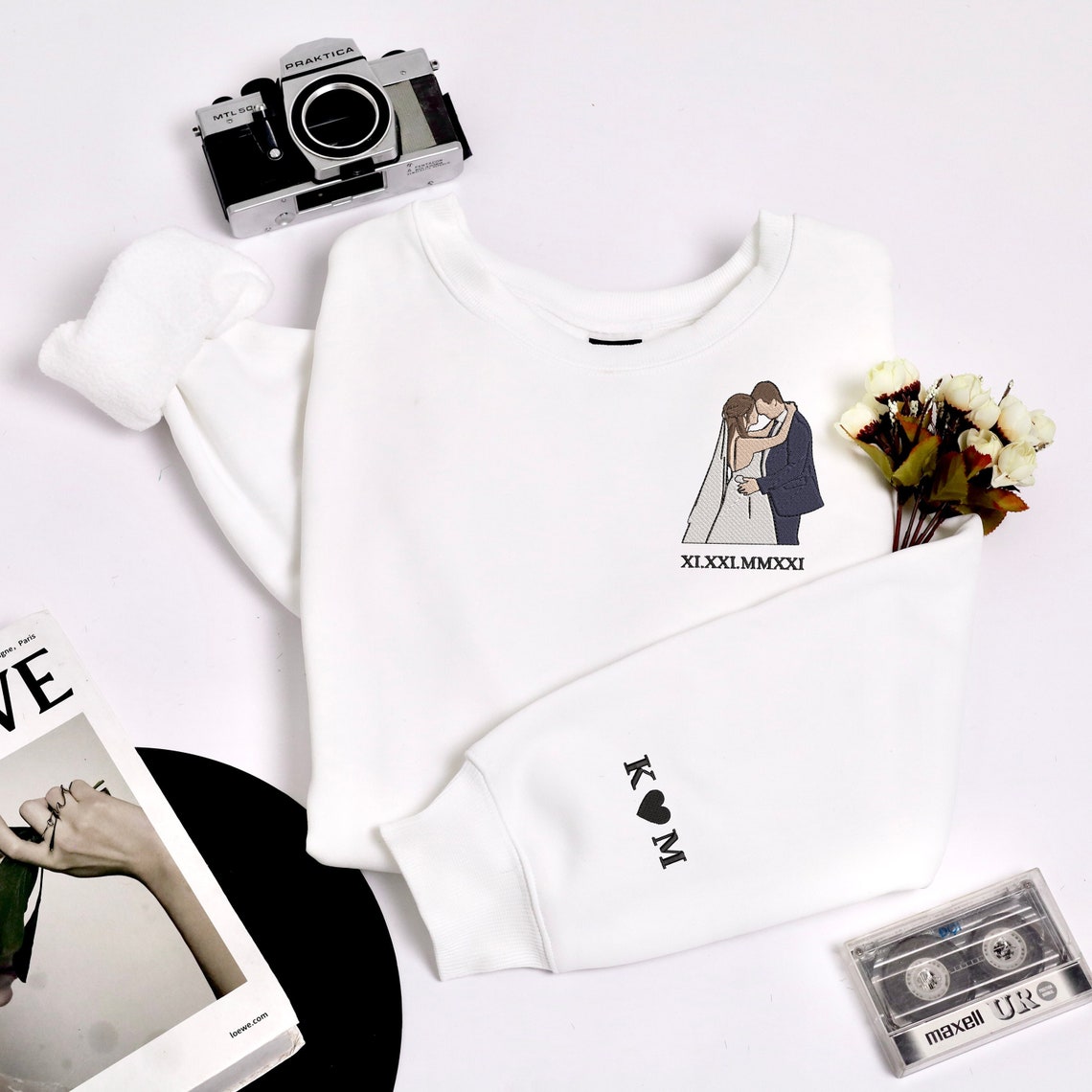 Embroidered Couple Portrait Sweatshirt Personalized Couple Photo with Roman Numerals Sweatshirt Gift for Anniversary
