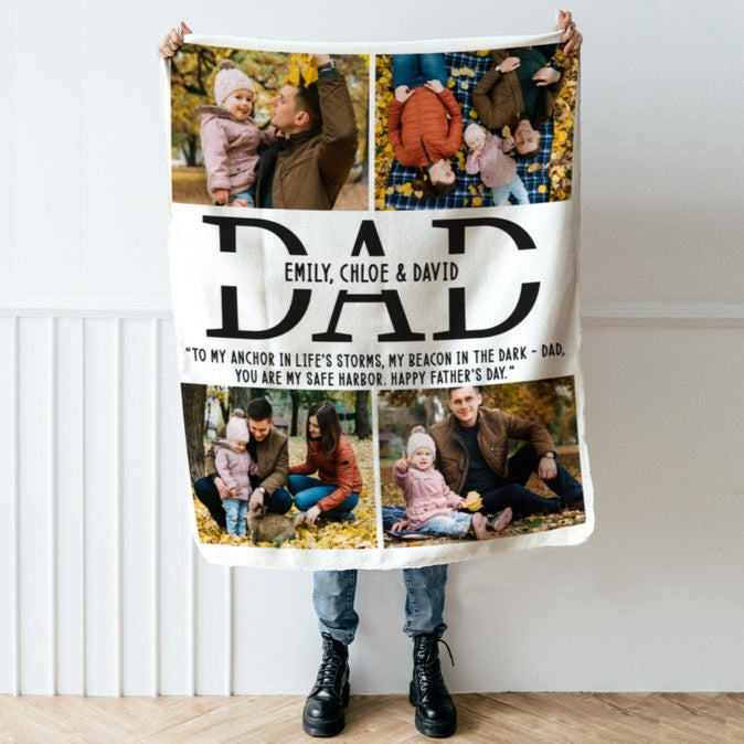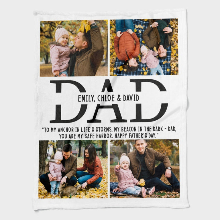 Personalized Photo Collage Blanket for Dad, made from soft flannel, available in multicolor and three sizes. Perfect for family activities, this unique keepsake features your custom photos on one side and a cozy white reverse side. Ideal for heartfelt gifts and memorable moments.