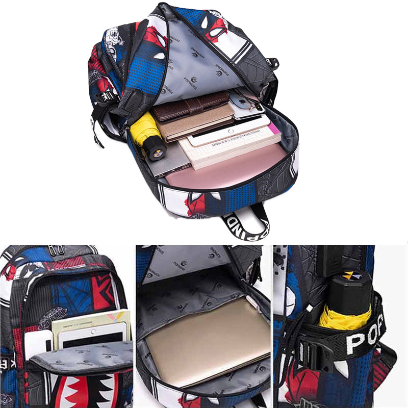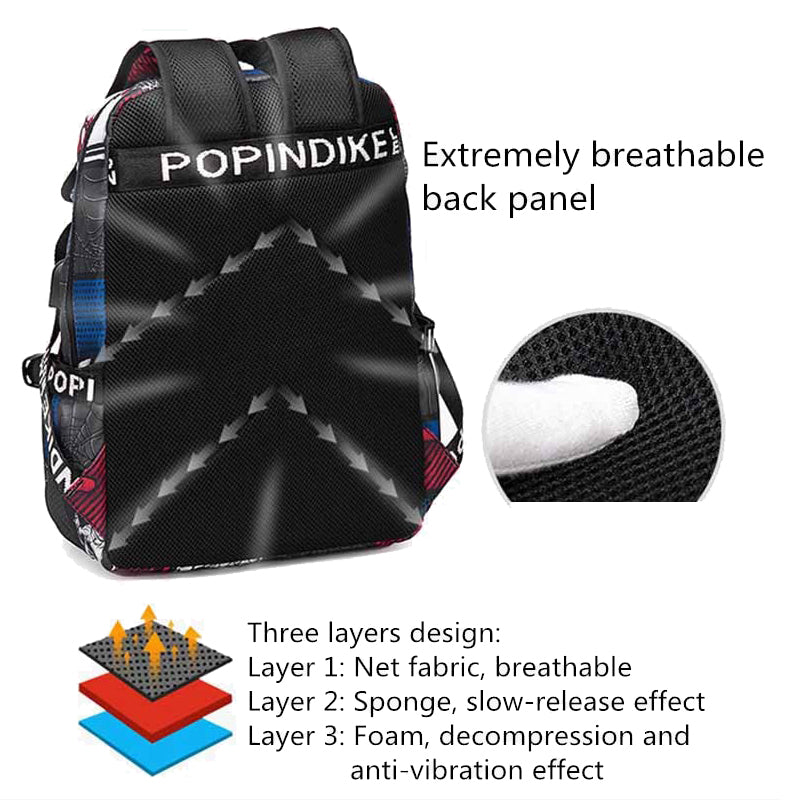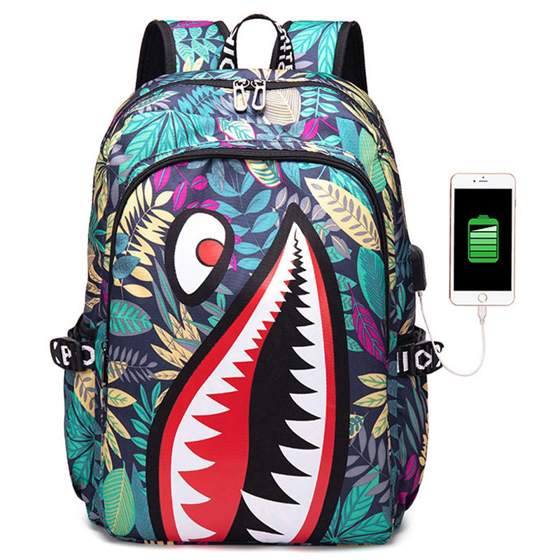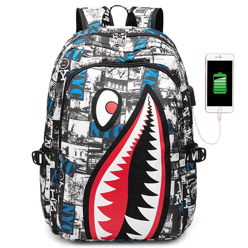 Features a unique shark teeth print for a bold and fun look. This backpack is made of durable nylon with a polyester lining, making it lightweight, water-resistant, dirt-resistant, and easy to clean. It offers a spacious main compartment, a front zip pocket, two side pockets, and an interior power bank pocket for organized storage. Built with adjustable, padded, breathable mesh shoulder straps and a thick back pad to reduce strain and protect the spine. A top handle allows easy carrying or hanging. The built-in USB port provides convenient device charging (power bank not included). This backpack can fit items such as a tablet, laptop up to 14 inches, notebooks, folders, and other daily essentials. Ideal for school, travel, gym, or casual use.